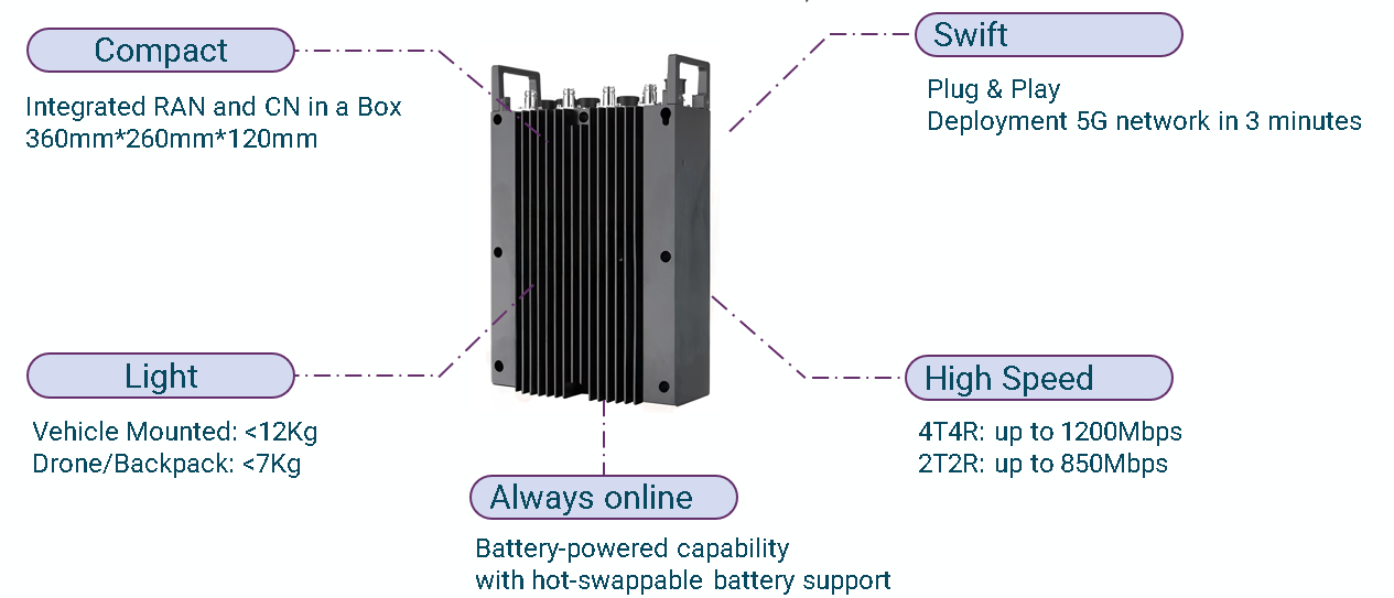 The Swift5G sets a new industry benchmark as a fully integrated, plug-and-play 5G network solution. By incorporating both RAN and Core Network functions into a single box, it enables rapid deployment of a standards-compliant mobile network within three minutes. Complete with all necessary hardware and software components, the system delivers immediate 5G connectivity in any environment—operating independently without reliance on grid power, terrestrial networks, or accessible roads.